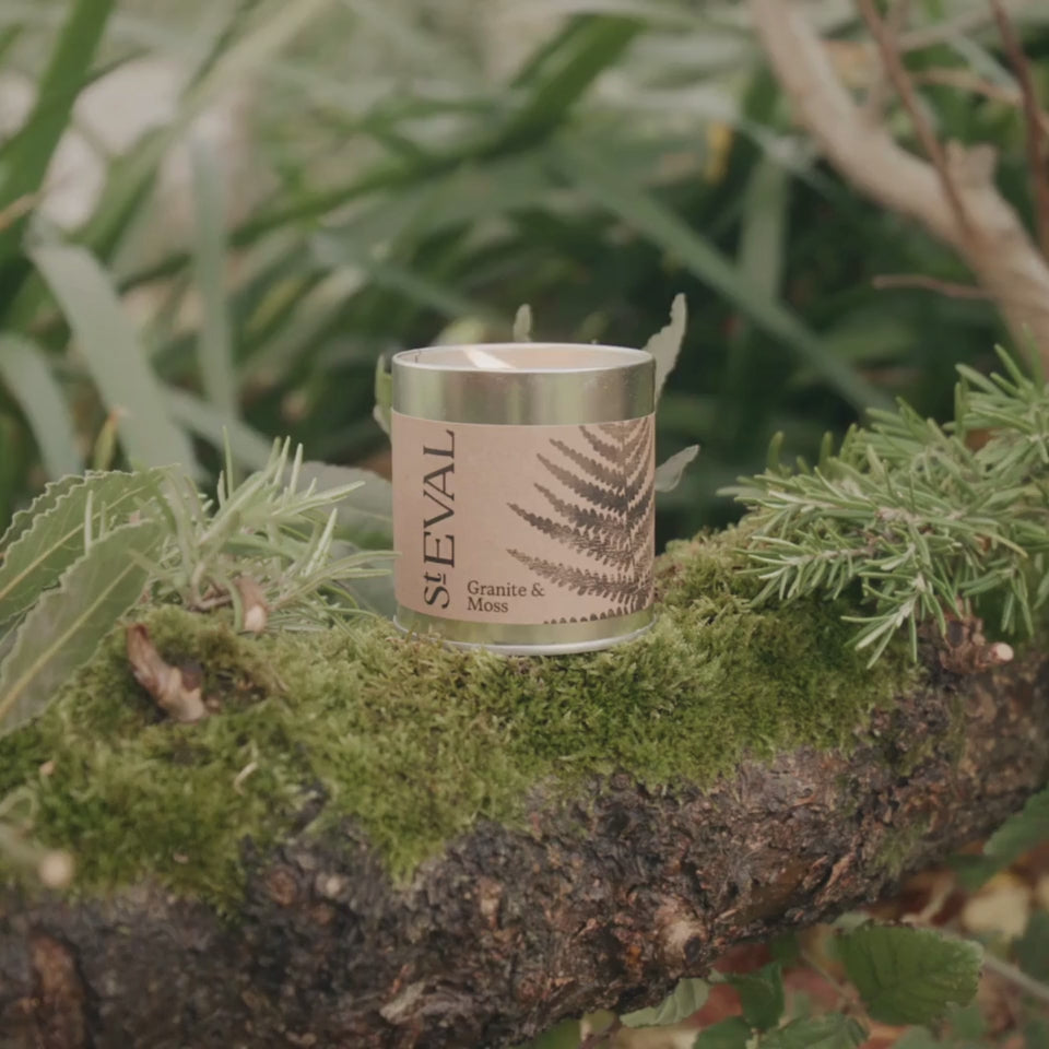 Our Granite & Moss Tin Candle evokes the untamed beauty of the moors, blending crisp, wild air with the quiet mystery of the woodland.